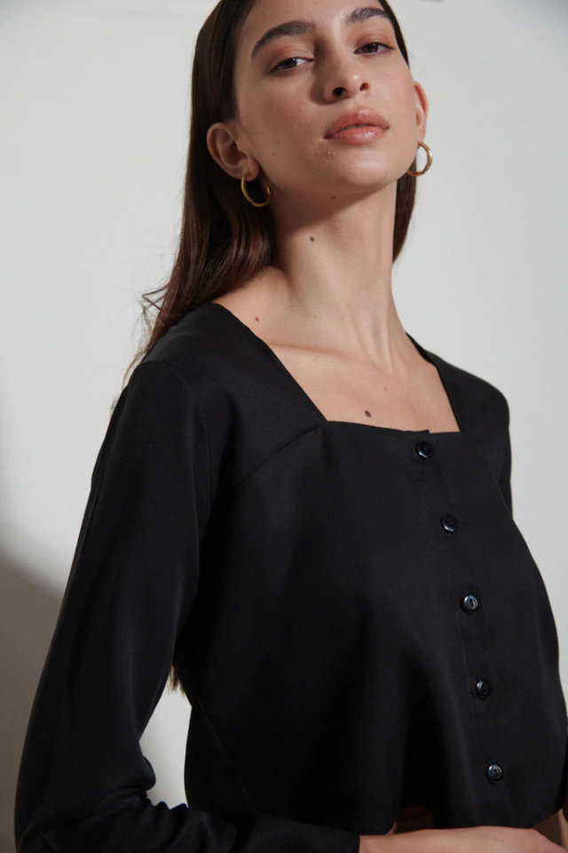 - Camisa crop de tencel manga larga escote cuadrado con cartera con botones.